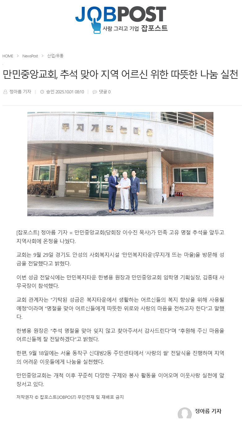 ¸¸¹ÎÁß¾Ó±³È¸(´çȸÀå À̼öÁø ¸ñ»ç)°¡ Ãß¼®À» ¾ÕµÎ°í Áö¿ª»çȸÀÇ µû¶æÇÑ ³ª´®À» ½ÇõÇß´Ù. ±³È¸´Â 9¿ù 29ÀÏ °æ±âµµ ¾È¼ºÀÇ »çȸº¹Áö½Ã¼³ '¸¸¹Îº¹ÁöŸ¿î'(¹«Áö°³ ¶ß´Â ¸¶À»)À» ¹æ¹®ÇØ ¼º±ÝÀ» Àü´ÞÇß´Ù. ...