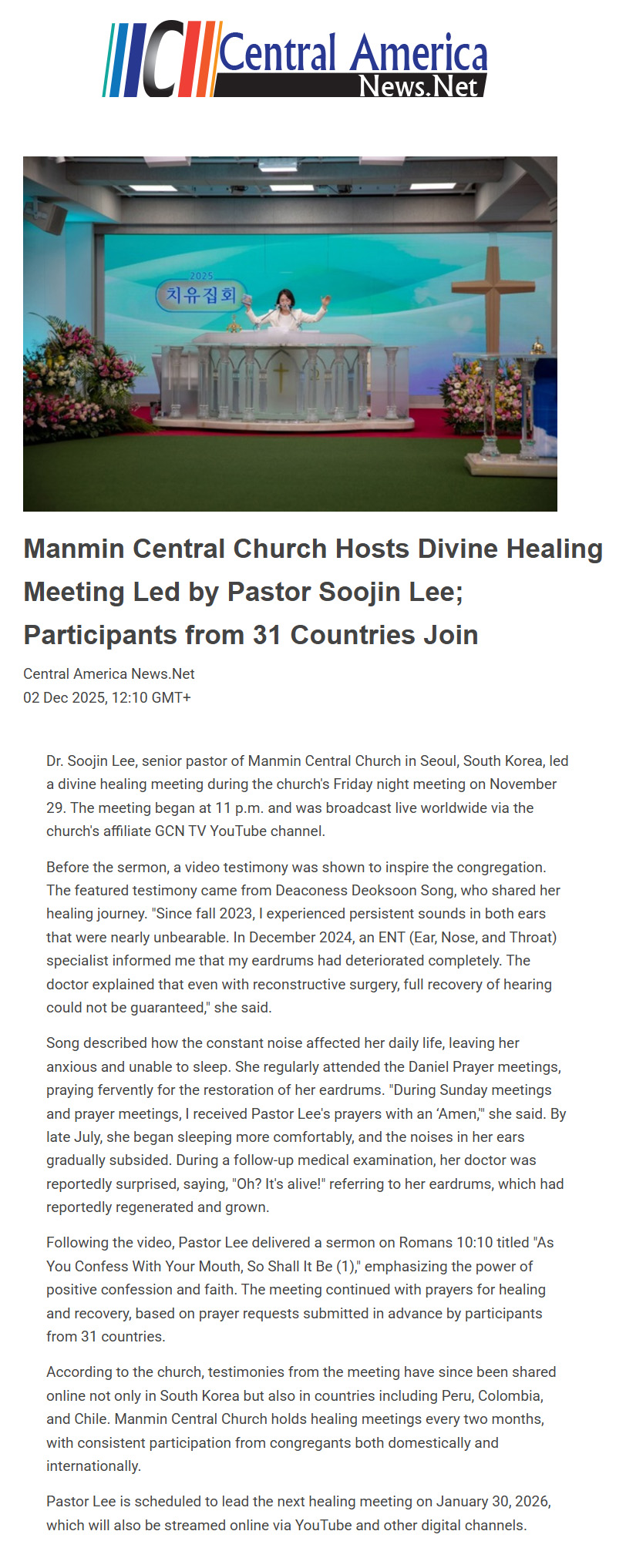 Manmin Central Church Hosts Divine Healing Meeting Led by Pastor Soojin Lee; Participants from 31 Countries Join