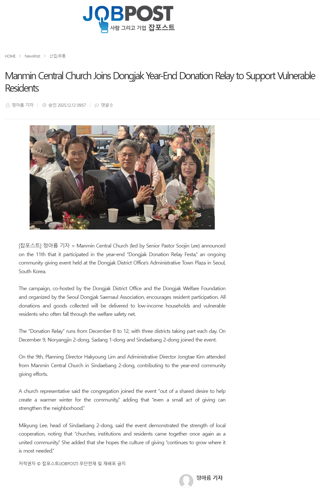 Manmin Central Church Joins Dongjak Year-End Donation Relay to Support Vulnerable Residents