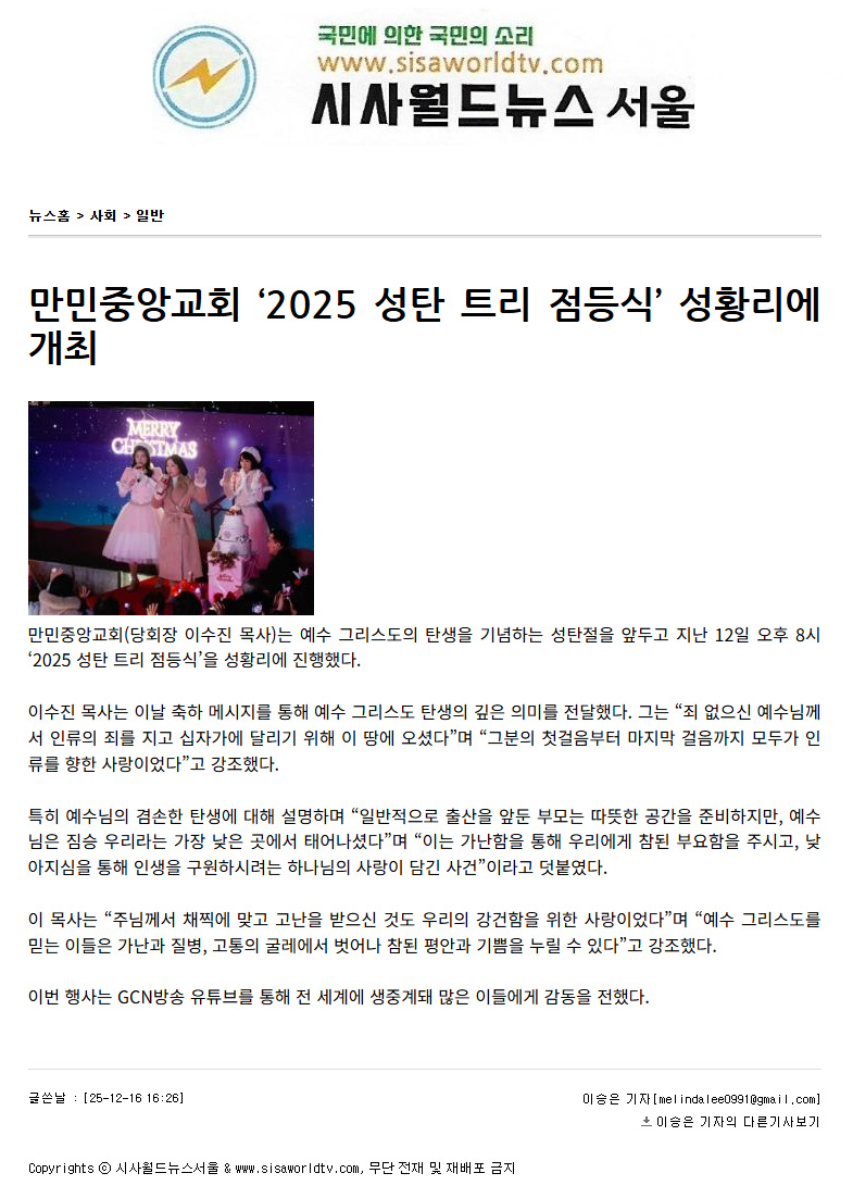 ¸¸¹ÎÁß¾Ó±³È¸ '2025 ¼ºÅº Æ®¸® Á¡µî½Ä' ¼ºÈ²¸®¿¡ °³ÃÖ