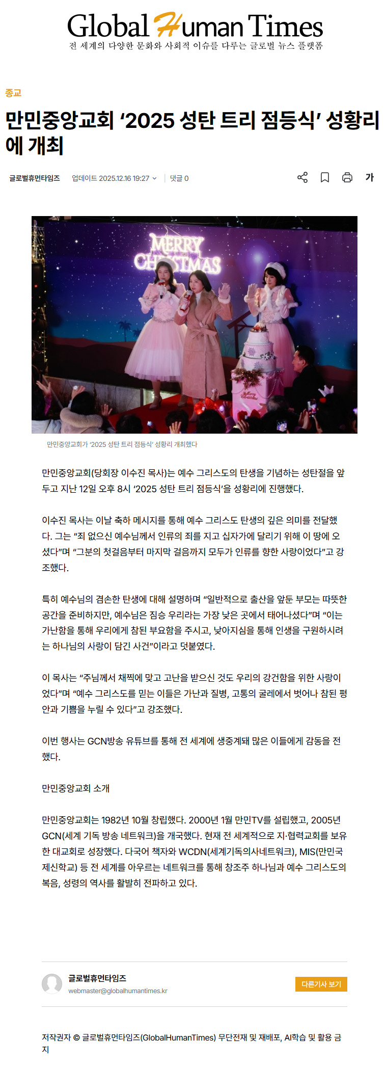 ¸¸¹ÎÁß¾Ó±³È¸ '2025 ¼ºÅº Æ®¸® Á¡µî½Ä' ¼ºÈ²¸®¿¡ °³ÃÖ
