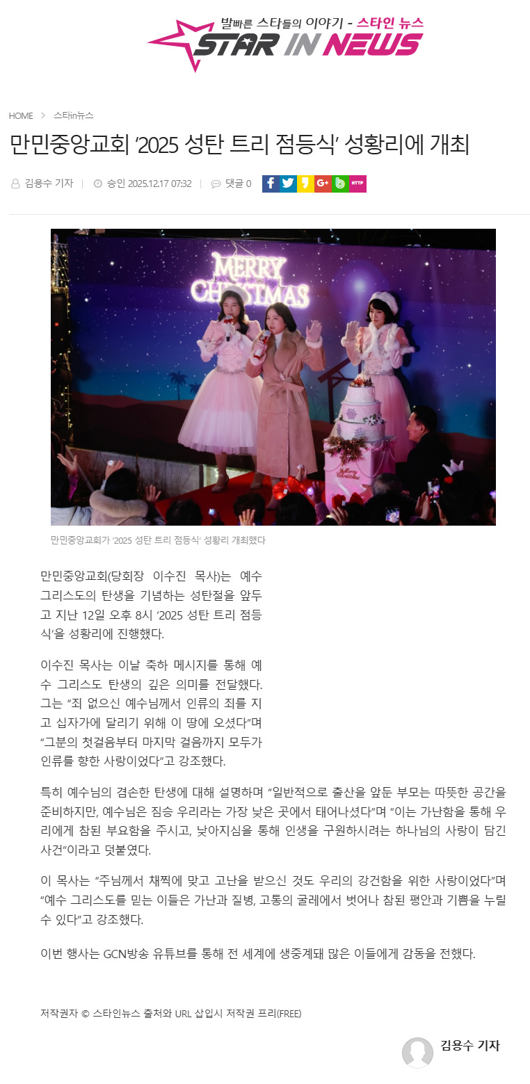 ¸¸¹ÎÁß¾Ó±³È¸ '2025 ¼ºÅº Æ®¸® Á¡µî½Ä' ¼ºÈ²¸®¿¡ °³ÃÖ