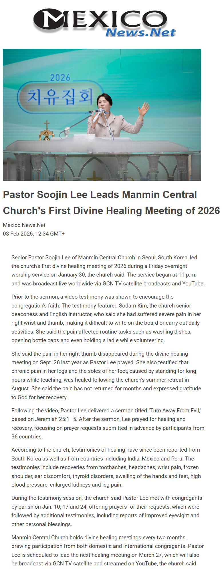 Pastor Soojin Lee Leads Manmin Central Church's First Divine Healing Meeting of 2026