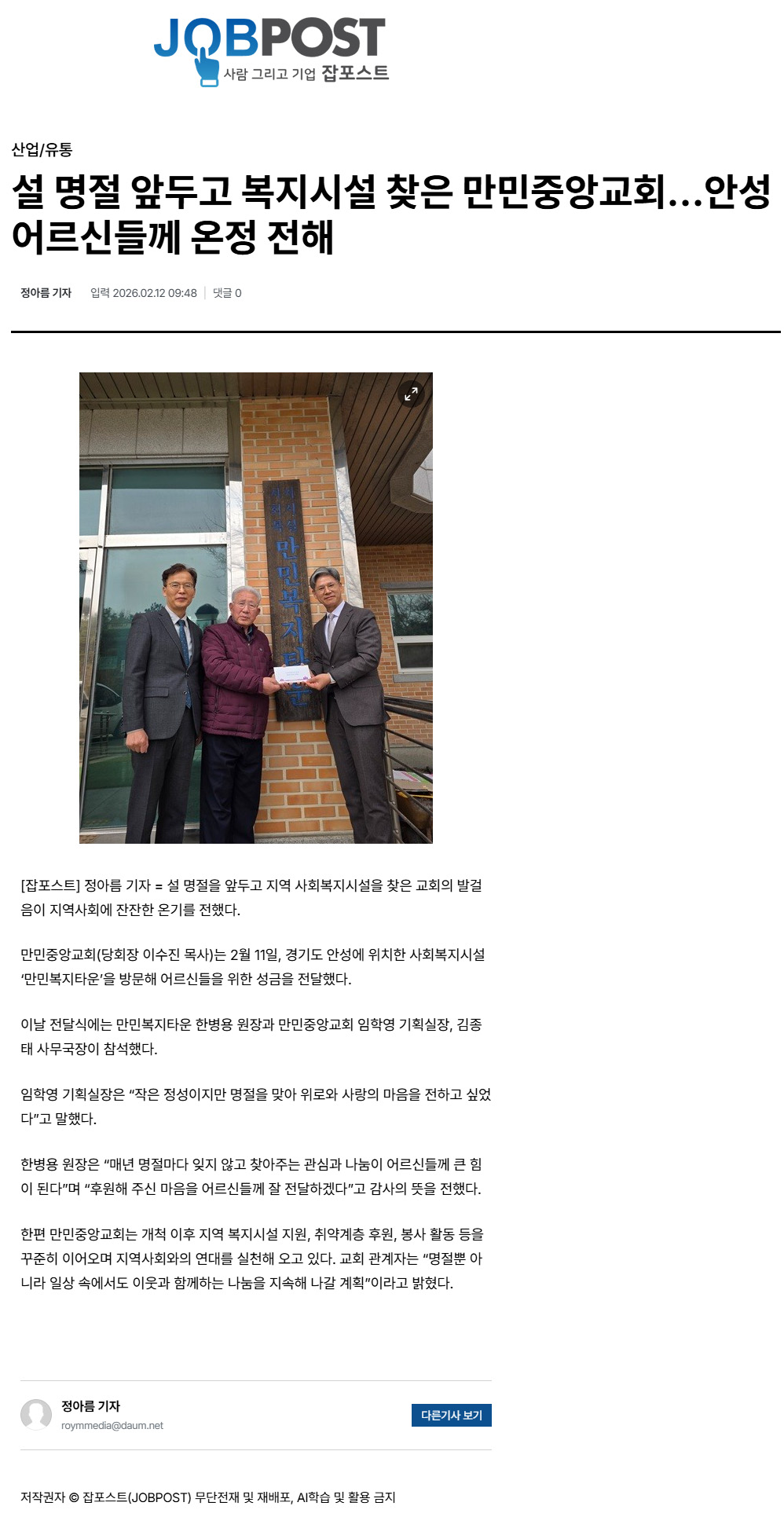 ¼³ ¸íÀýÀ» ¾ÕµÎ°í Áö¿ª »çȸº¹Áö½Ã¼³À» ãÀº ±³È¸ÀÇ ¹ß°ÉÀ½ÀÌ Áö¿ª»çȸ¿¡ ÀÜÀÜÇÑ ¿Â±â¸¦ ÀüÇß´Ù. ¸¸¹ÎÁß¾Ó±³È¸(´çȸÀå À̼öÁø ¸ñ»ç)´Â 2¿ù 11ÀÏ, °æ±âµµ ¾È¼º¿¡ À§Ä¡ÇÑ »çȸº¹Áö½Ã¼³ '¸¸¹Îº¹ÁöŸ¿î'À» ¹æ¹®ÇØ ¾î¸£½ÅµéÀ» À§ÇÑ ¼º±ÝÀ» Àü´ÞÇß´Ù. ...